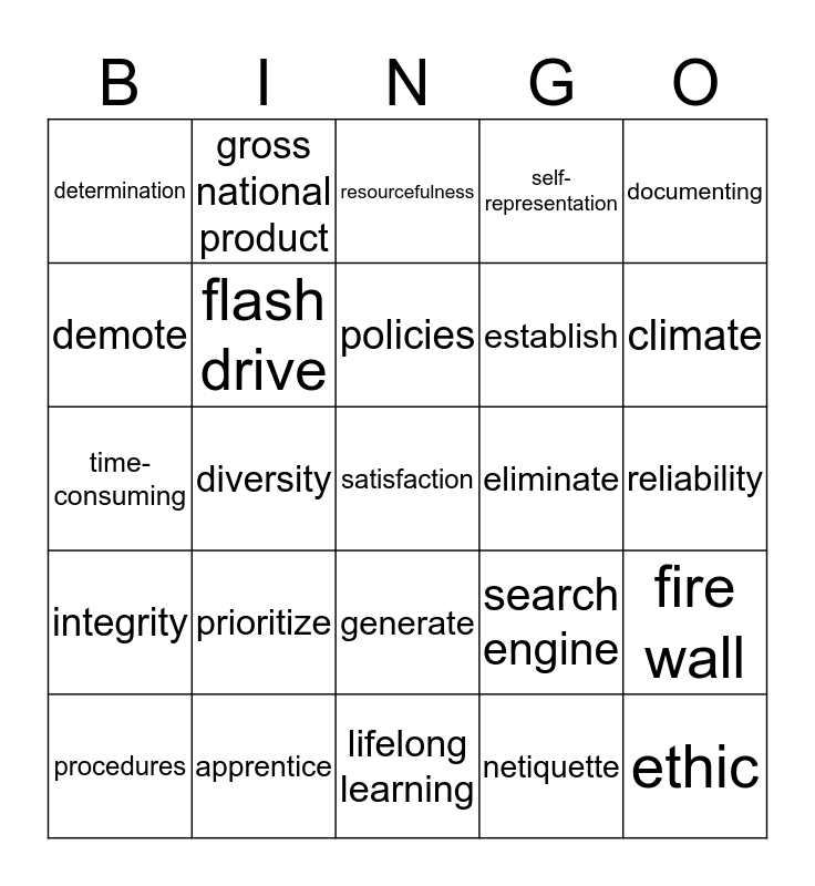 This bingo card has a free space and 24 words: prioritize, apprentice, policies, procedures, documenting, determination, demote, gross national product, eliminate, generate, establish, time-consuming, search engine, fire wall, flash drive, netiquette, reliability, resourcefulness, climate, diversity, ethic, integrity, self-representation and lifelong learning.