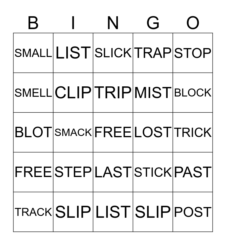 This bingo card has a free space and 24 words: STEP, SLIP, TRIP, TRACK, STOP, SMALL, SMELL, LIST, LOST, LAST, MIST, BLOT, STICK, PAST, CLIP, SLIP, TRICK, SLICK, BLOCK, SMACK, POST, FREE, TRAP and LIST.