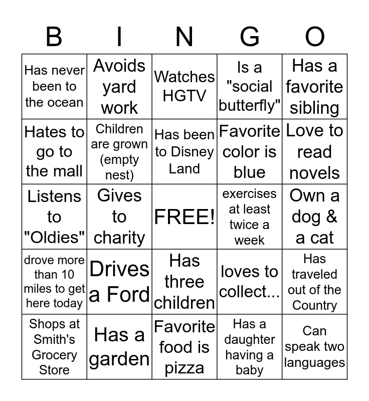 This bingo card has a free space and 24 words: Drives a Ford, Has a garden, Has been to Disney Land, Shops at Smith's Grocery Store, Has a favorite sibling, Has never been to the ocean, Hates to go to the mall, Avoids yard work, exercises at least twice a week, Has three children, Favorite color is blue, Listens to "Oldies", loves to collect..., Has traveled out of the Country, Children are grown (empty nest), Has a daughter having a baby, Own a dog & a cat, Watches HGTV, Love to read novels, Gives to charity, Can speak two languages, drove more than 10 miles to get here today, Is a "social butterfly" and Favorite food is pizza.