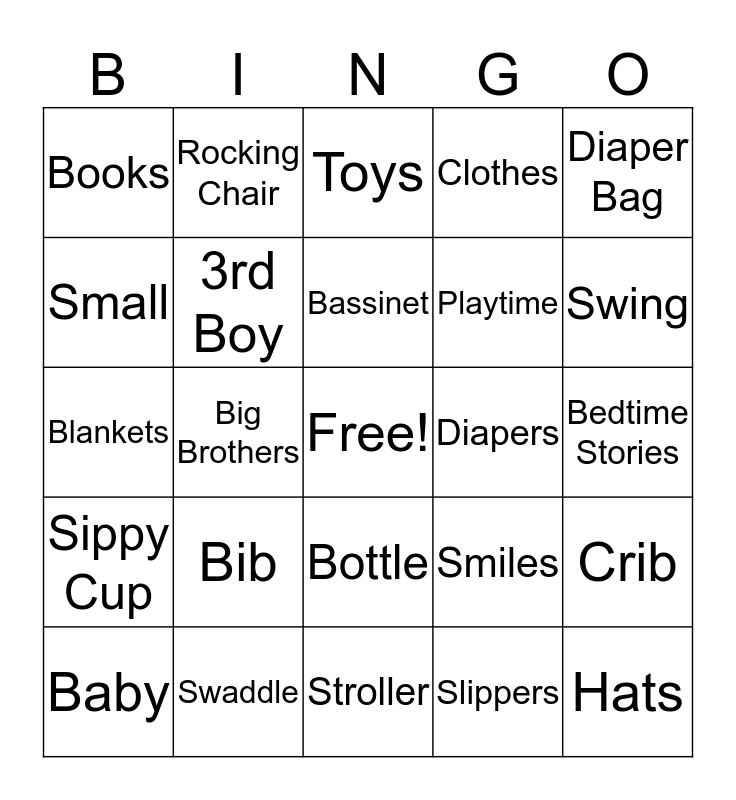 This bingo card has a free space and 24 words: Bib, Swaddle, Bassinet, Baby, Diaper Bag, Books, Small, Rocking Chair, Diapers, Bottle, Playtime, Blankets, Smiles, Crib, 3rd Boy, Slippers, Bedtime Stories, Toys, Swing, Big Brothers, Hats, Sippy Cup, Clothes and Stroller.