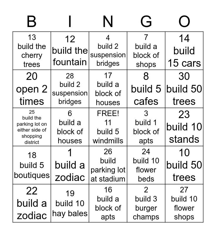 This bingo card has a free space and 24 words: 1 build a zodiac, 19 build 10 hay bales, 17 build a block of houses, 22 build a zodiac, 14 build 15 cars, 13 build the cherry trees, 20 open 2 times, 12 build the fountain, 3 build 1 block of apts, 26 build parking lot at stadium, 8 build 5 cafes, 25 build the parking lot on either side of shopping district, 24 build 10 flower beds, 10 build 50 trees, 28 build 2 suspension bridges, 2 build 3 burger champs, 23 build 10 stands, 4 build 2 suspension bridges, 30 build 50 trees, 6 build a block of houses, 27 build 10 flower shops, 18 build 5 boutiques, 7 build a block of shops and 16 build a block of apts.