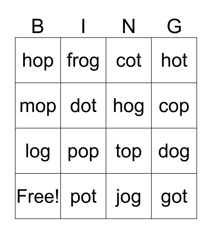 This bingo card has 16 words: pot, dog, cot, hop, log, frog, top, jog, mop, dot, Free!, hot, pop, cop, hog and got.