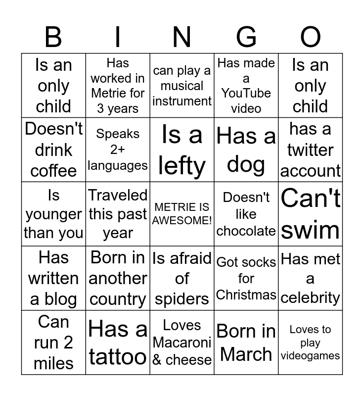 This bingo card has a free space and 24 words: Born in another country, Has a tattoo, Is a lefty, Can run 2 miles, Is an only child, Is an only child, Doesn't drink coffee, Has worked in Metrie for 3 years, Doesn't like chocolate, Is afraid of spiders, Has a dog, Is younger than you, Got socks for Christmas, Has met a celebrity, Speaks 2+ languages, Born in March, Can't swim, can play a musical instrument, has a twitter account, Traveled this past year, Loves to play videogames, Has written a blog, Has made a YouTube video and Loves Macaroni & cheese.