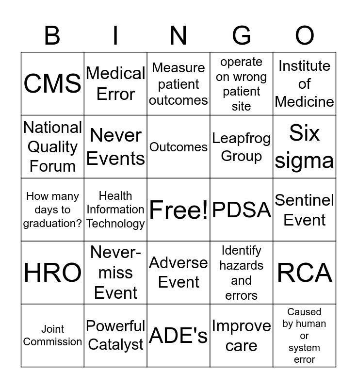 This bingo card has a free space and 24 words: Never-miss Event, Powerful Catalyst, Outcomes, Joint Commission, Institute of Medicine, CMS, National Quality Forum, Medical Error, PDSA, Adverse Event, Leapfrog Group, How many days to graduation?, Identify hazards and errors, RCA, Never Events, Improve care, Sentinel Event, Measure patient outcomes, Six sigma, Health Information Technology, Caused by human or system error, HRO, operate on wrong patient site and ADE's.