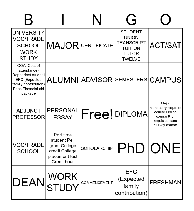 This bingo card has a free space and 79 words: ACT/SAT ADJUNCT PROFESSOR ADVISOR ALUMNI APPLICATION, AUDIT ASSOCIATE’S BACHELOR’S BOARD OF TRUSTEES CAMPUS, CERTIFICATE, COMMENCEMENT, COMMUNITY COLLEGE DEAN DIPLOMA, DORMS FAFSA FEES FINANCIAL AID FRESHMAN, GRADE POINT AVERAGE GRANT JUNIOR LECTURES LOAN, MAJOR MASTER’S MINOR NCAA OFFICE HOURS, ONE PERSONAL ESSAY PhD PREREQUISITE PROFESSOR, QUARTERS REGISTER RESIDENCE HALLS RESIDENT ADVISOR/ASSISTANT ROOM AND BOARD, SCHOLARSHIP, SEMESTERS SENIOR SIXTY-SEVEN PERCENT SOPHOMORE, STUDENT UNION TRANSCRIPT TUITION TUTOR TWELVE, UNIVERSITY VOC/TRADE SCHOOL WORK STUDY, UTRGV PUF, COA (Cost of attendance) Dependent student EFC (Expected family contribution) Fees Financial aid package, Full time student Higher education Independent student Loan forgiveness Matriculation, Part time student Pell grant College credit College placement test Credit hour, Co-Requisite classes Developmental courses Elective courses Faculty Interdisciplinary course, Major Mandatory/requisite course Online course Pre-requisite class Survey course, Syllabus Private college or university Public college or university Proprietary school, ACT/SAT, ADJUNCT PROFESSOR, ADVISOR, ALUMNI, APPLICATION, AUDIT, ASSOCIATE’S, BACHELOR’S, BOARD OF TRUSTEES, CAMPUS, CERTIFICATE, COMMENCEMENT, COMMUNITY COLLEGE, DEAN, DIPLOMA, DORMS FAFSA, FEES, FINANCIAL AID, FRESHMAN, GRADE POINT AVERAGE, GRANT, JUNIOR, LECTURES, LOAN, MAJOR, MASTER’S, MINOR, NCAA, OFFICE HOURS, ONE, PERSONAL ESSAY, PhD, PREREQUISITE, PROFESSOR, QUARTERS, REGISTER, RESIDENCE HALLS, RESIDENT ADVISOR/ASSISTANT ROOM AND BOARD, SCHOLARSHIP, SEMESTERS, SENIOR SIXTY-SEVEN PERCENT, SOPHOMORE, STUDENT UNION, TRANSCRIPT, TUITION, TUTOR, TWELVE, UNIVERSITY, VOC/TRADE SCHOOL, WORK STUDY, UTRGV, PUF, COA (Cost of attendance), Dependent student, EFC (Expected family contribution), Fees, Financial aid package and Full time student.