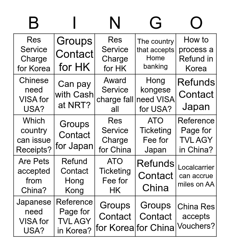 This bingo card has a free space and 44 words: Tax for NRT Admirals Day Pass, China Res accepts Vouchers?, ATO Ticketing Fee for Korea, Japanese need VISA for USA?, Are Pets accepted from HK?, Groups Contact for China, Res Service Charge for HK, RTW Service Charge for Japan, How to process a Refund in Korea, Reference Page for TVL AGY in Korea?, The country that accepts Home banking, ATO Ticketing Fee for Japan, ATO Ticketing Fee for HK, Refund Contact Hong Kong, Voucher Accepted in HK?, Groups Contact for Korea, Admirals Conference Room with RES?, Which country can issue Receipts?, Are Pets accepted from JP?, Refunds Contact Japan, Groups Contact for HK, Agency Reference for Japan?, External Res Charge in China?, Res Service Charge for Korea, Voucher accepted in HK?, Reference Page for TVL AGY in China?, Voucher accepted in JP?, Reference Page for TVL AGY in HK?, Refunds Contact China, Are Pets accepted from China?, Country that needs to assist AGY in reissues, Localcarrier can accrue miles on AA, Law Enforcement may rqst pax info, Are Pets accepted from Korea?, Groups Contact for Japan, Groups Contact for Japan, ATO Ticketing Fee for China, RTW Service Charge for HK, Award Service charge fall all, Chinese need VISA for USA?, Hong kongese need VISA for USA?, Koreans need VISA for USA?, Can pay with Cash at NRT? and Can pay with Cash in ICN?.