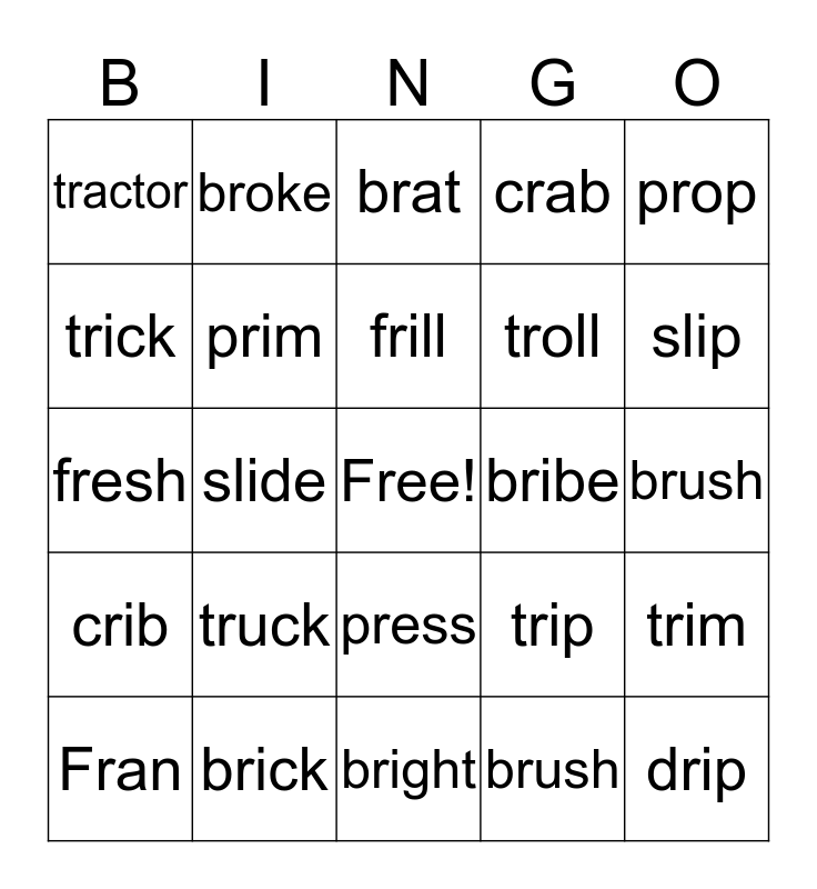 This bingo card has a free space and 24 words: truck, brick, frill, Fran, prop, tractor, trick, broke, bribe, press, troll, fresh, trip, trim, prim, brush, brush, brat, slip, slide, drip, crib, crab and bright.