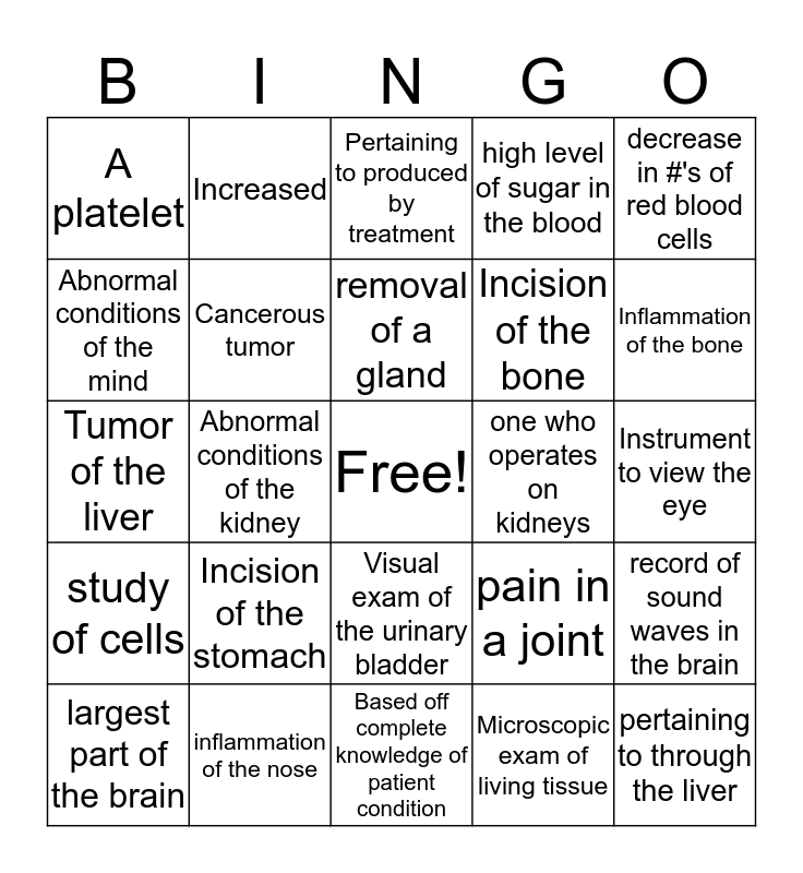This bingo card has a free space and 24 words: Incision of the stomach, inflammation of the nose, removal of a gland, largest part of the brain, decrease in #'s of red blood cells, A platelet, Abnormal conditions of the mind, Increased, one who operates on kidneys, Visual exam of the urinary bladder, Incision of the bone, Tumor of the liver, pain in a joint, record of sound waves in the brain, Cancerous tumor, Microscopic exam of living tissue, Instrument to view the eye, Pertaining to produced by treatment, Inflammation of the bone, Abnormal conditions of the kidney, pertaining to through the liver, study of cells, high level of sugar in the blood and Based off complete knowledge of patient condition.
