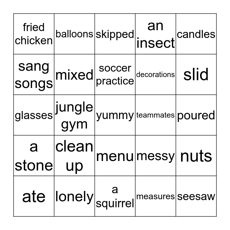 This bingo card has a free space and 24 words: clean up, lonely, soccer practice, ate, candles, fried chicken, sang songs, balloons, teammates, menu, decorations, glasses, messy, nuts, mixed, measures, poured, skipped, slid, jungle gym, seesaw, a stone, an insect and a squirrel.