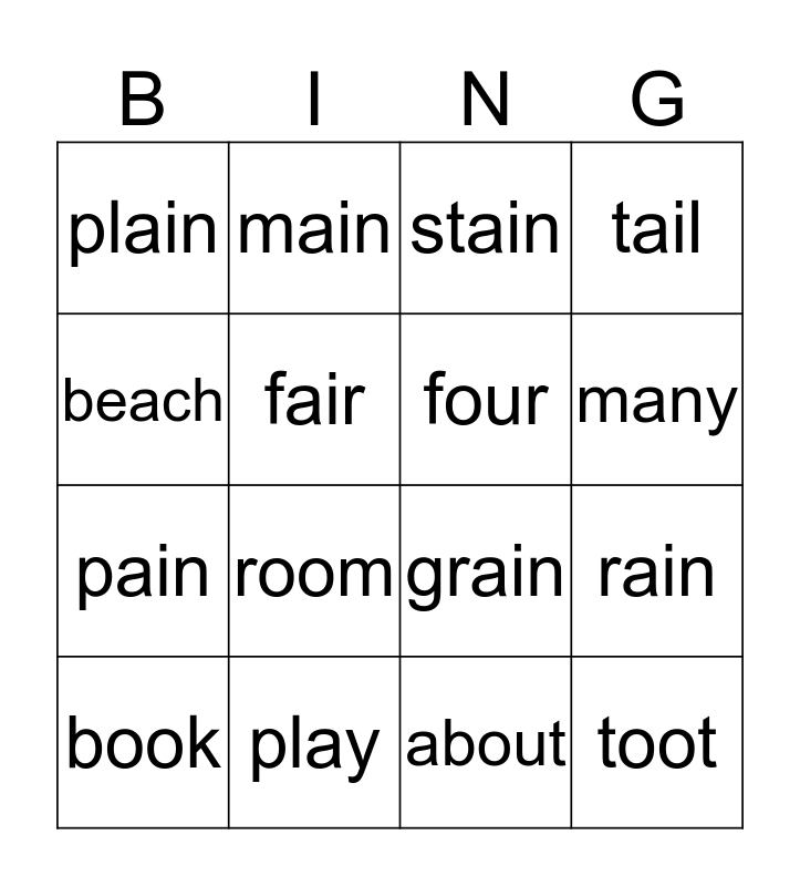 This bingo card has 16 words: play, rain, stain, plain, pain, main, grain, about, beach, fair, book, tail, room, many, four and toot.