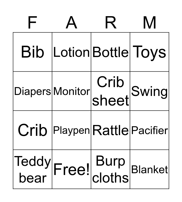This bingo card has 16 words: Free!, Pacifier, Bottle, Bib, Crib, Lotion, Rattle, Burp cloths, Diapers, Monitor, Teddy bear, Toys, Playpen, Swing, Crib sheet and Blanket.