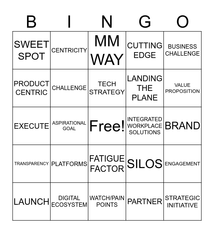 This bingo card has a free space and 24 words: PLATFORMS, DIGITAL ECOSYSTEM, TECH STRATEGY, LAUNCH, BUSINESS CHALLENGE, SWEET SPOT, PRODUCT CENTRIC, CENTRICITY, INTEGRATED WORKPLACE SOLUTIONS, FATIGUE FACTOR, LANDING THE PLANE, EXECUTE, SILOS, ENGAGEMENT, CHALLENGE, PARTNER, BRAND, MM WAY, VALUE PROPOSITION, ASPIRATIONAL GOAL, STRATEGIC INITIATIVE, TRANSPARENCY, CUTTING EDGE and WATCH/PAIN POINTS.