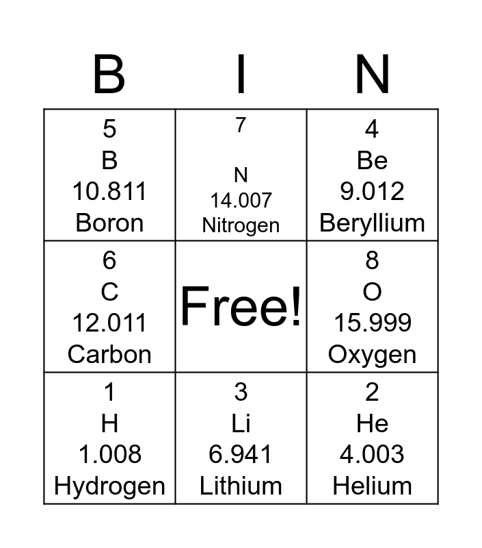 This bingo card has a free space and 8 words: 8 O 15.999 Oxygen, 4 Be 9.012 Beryllium, 7 N 14.007 Nitrogen, 1 H 1.008 Hydrogen, 5 B 10.811 Boron, 2 He 4.003 Helium, 6 C 12.011 Carbon and 3 Li 6.941 Lithium.