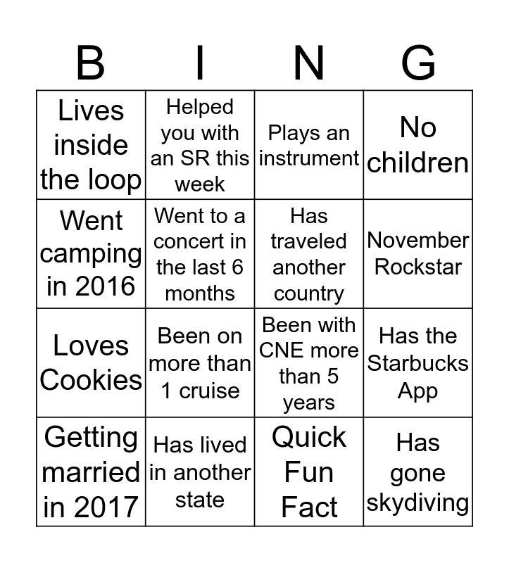 This bingo card has 16 words: Has lived in another state, Has the Starbucks App, Plays an instrument, Lives inside the loop, Loves Cookies, Helped you with an SR this week, Been with CNE more than 5 years, Quick Fun Fact, Went camping in 2016, Went to a concert in the last 6 months, Getting married in 2017, No children, Been on more than 1 cruise, November Rockstar, Has traveled another country and Has gone skydiving.