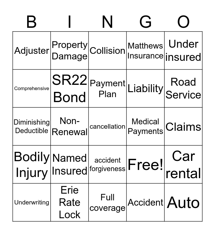 This bingo card has 27 words: Free!, Auto, Liability, Full coverage, Comprehensive, Collision, Property Damage, Bodily Injury, Medical Payments, Car rental, Diminishing Deductible, Matthews Insurance, Underwriting, Erie Rate Lock, Road Service, Non-Owned Auto, SR22 Bond, Payment Plan, Named Insured, Adjuster, Claims, Accident, Non-Renewal, cancellation, accident forgiveness, Under insured and Deductible.