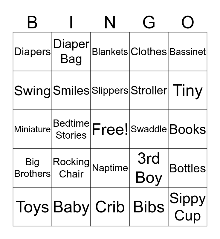 This bingo card has a free space and 24 words: Rocking Chair, Baby, Slippers, Toys, Bassinet, Diapers, Swing, Diaper Bag, Swaddle, Naptime, Stroller, Miniature, 3rd Boy, Bottles, Smiles, Bibs, Books, Blankets, Tiny, Bedtime Stories, Sippy Cup, Big Brothers, Clothes and Crib.
