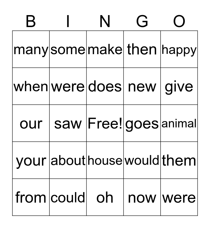 This bingo card has a free space and 24 words: about, could, does, from, happy, many, when, some, goes, house, new, our, would, them, were, now, animal, make, give, saw, were, your, then and oh.