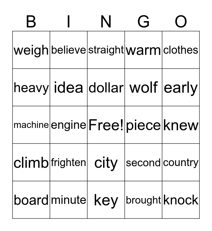This bingo card has a free space and 29 words: board, building, engine, whistle, weigh, straight, idea, frighten, piece, minute, knew, knock, key, brought, early, field, city, climb, clothes, machine, second, sign, wolf, heavy, warm, believe, country, dollar and weight.