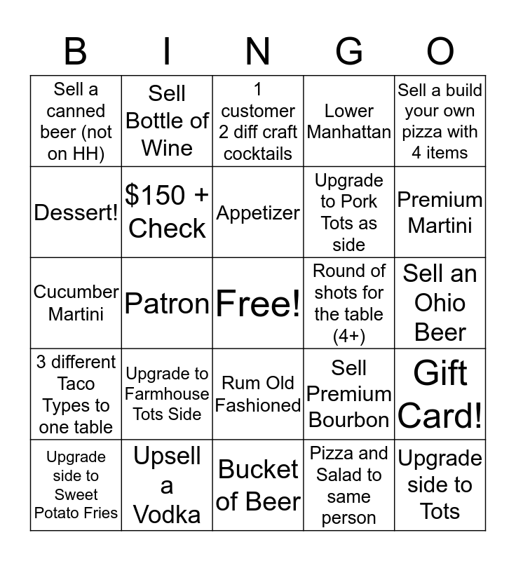 This bingo card has a free space and 24 words: Upgrade to Farmhouse Tots Side, Upsell a Vodka, Appetizer, Upgrade side to Sweet Potato Fries, Sell a build your own pizza with 4 items, Sell a canned beer (not on HH), Dessert!, Sell Bottle of Wine, Round of shots for the table (4+), Rum Old Fashioned, Upgrade to Pork Tots as side, Cucumber Martini, Sell Premium Bourbon, Gift Card!, $150 + Check, Pizza and Salad to same person, Sell an Ohio Beer, 1 customer 2 diff craft cocktails, Premium Martini, Patron, Upgrade side to Tots, 3 different Taco Types to one table, Lower Manhattan and Bucket of Beer.