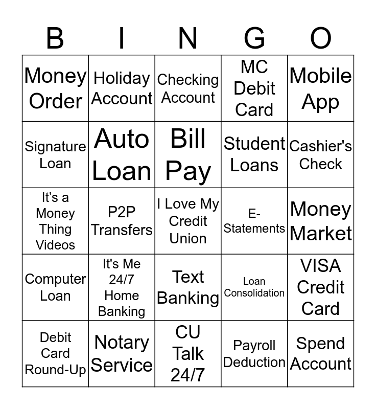 This bingo card has a free space and 37 words: Apple Pay, e-Deposit, CO-OP Network, Auto Loan, VISA Credit Card, It's Me 24/7 Home Banking, Bill Pay, CardNav App, Mobile App, A2A Transfers, P2P Transfers, MC Debit Card, Spend Account, Money Market, Signature Loan, Computer Loan, Savings Account, Checking Account, Text Banking, E-Statements, Money Order, Cashier's Check, Debit Card Round-Up, CU Talk 24/7, Virtual Strong Box, Payroll Deduction, Holiday Account, Certificate of Deposit, Home Equity Loan, Quick Loan Application, Direct Deposit, Notary Service, It’s a Money Thing Videos, Computer Loan, Loan Consolidation, Student Loans and Text Messaging.