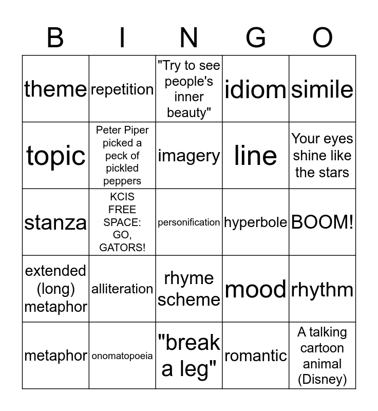 This bingo card has a free space and 24 words: alliteration, onomatopoeia, imagery, metaphor, simile, theme, topic, repetition, hyperbole, rhyme scheme, line, stanza, mood, rhythm, Peter Piper picked a peck of pickled peppers, romantic, BOOM!, "Try to see people's inner beauty", Your eyes shine like the stars, KCIS FREE SPACE: GO, GATORS!, A talking cartoon animal (Disney), extended (long) metaphor, idiom and "break a leg".