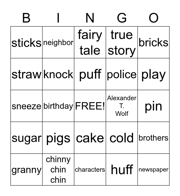This bingo card has a free space and 24 words: pigs, chinny chin chin, puff, granny, bricks, sticks, straw, neighbor, Alexander T. Wolf, cake, police, sneeze, cold, brothers, knock, huff, pin, fairy tale, play, birthday, newspaper, sugar, true story and characters.