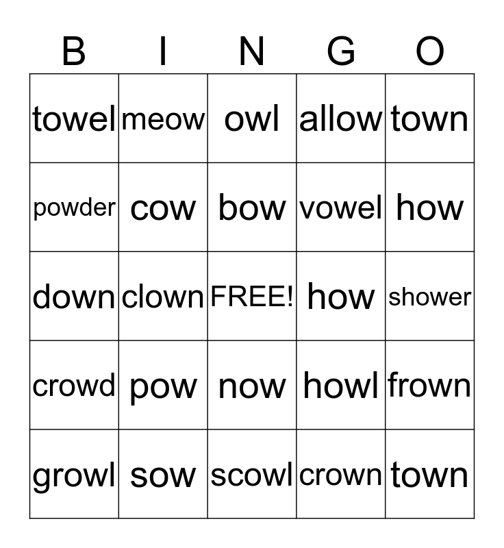This bingo card has a free space and 24 words: pow, sow, bow, growl, town, towel, powder, meow, how, now, vowel, down, howl, frown, cow, crown, shower, owl, how, clown, town, crowd, allow and scowl.