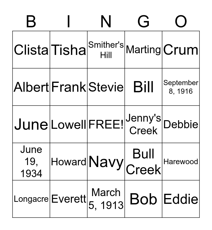 This bingo card has a free space and 24 words: Howard, Everett, Stevie, Longacre, Crum, Clista, Albert, Tisha, Jenny's Creek, Navy, Bill, June, Bull Creek, Harewood, Frank, Bob, Debbie, Smither's Hill, September 8, 1916, Lowell, Eddie, June 19, 1934, Marting and March 5, 1913.