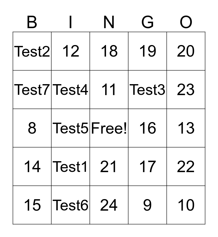 This bingo card has a free space and 24 words: Test1, Test6, 11, 15, 20, Test2, Test7, 12, 16, 21, Test3, 8, 17, 22, Test4, 9, 13, 18, 23, Test5, 10, 14, 19 and 24.