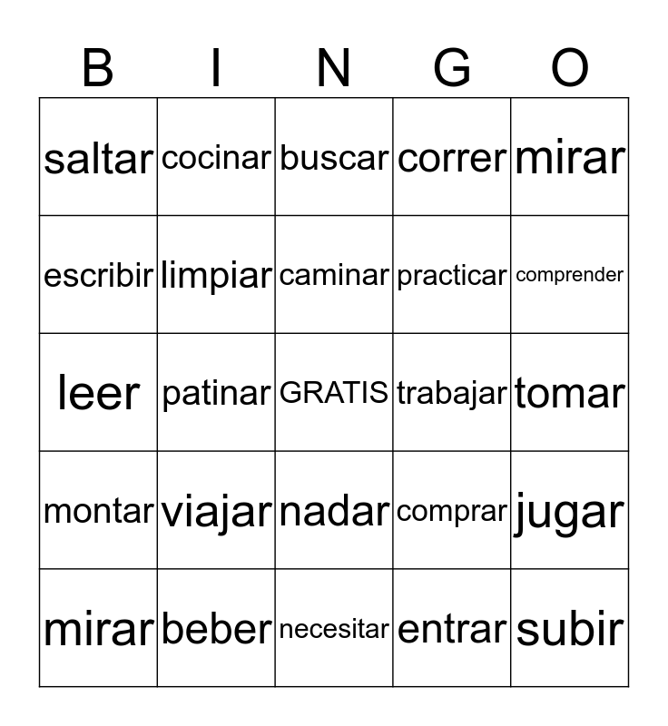 This bingo card has a free space and 41 words: abrir, leer, bailar, limpiar, beber, nadar, caminar, cantar, mirar, montar, patinar, correr, subir, tomar, trabajar, viajar, llevar, saltar, aprender, buscar, jugar, tocar, necesitar, practicar, preparar, recibir un regalo, entrar, visitar, comprender, esquiar, estudiar, cocinar, mirar, comer, comprar, escribir, escuchar, tomar el sol, hablar, lavar and vivir.