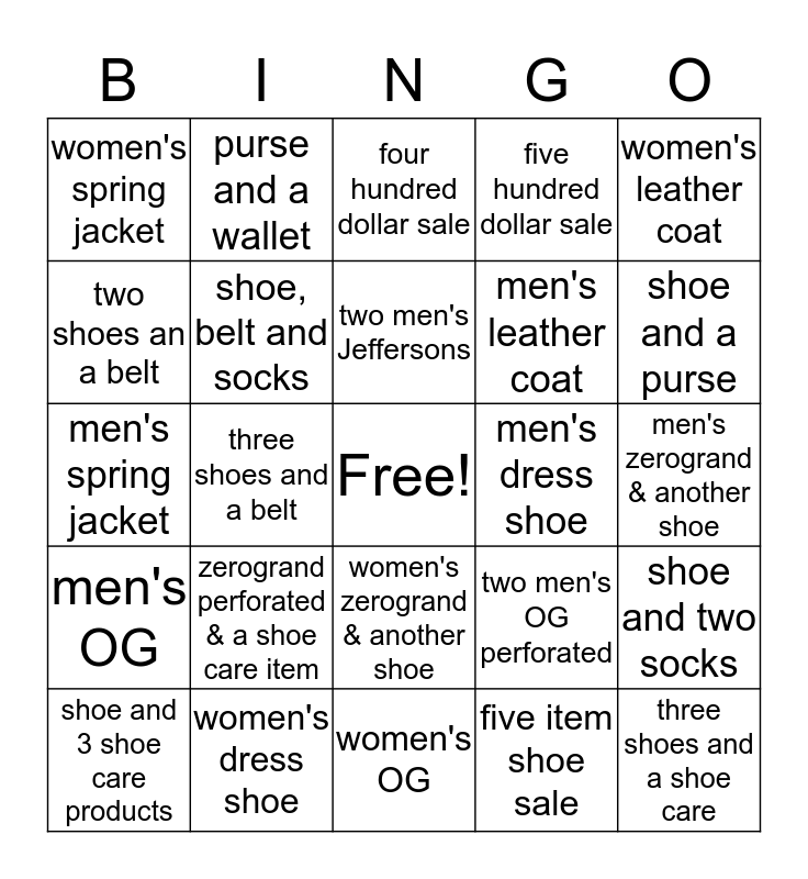 This bingo card has a free space and 24 words: zerogrand perforated & a shoe care item, women's dress shoe, two men's Jeffersons, shoe and 3 shoe care products, women's leather coat, women's spring jacket, two shoes an a belt, purse and a wallet, men's dress shoe, women's zerogrand & another shoe, men's leather coat, men's spring jacket, two men's OG perforated, shoe and two socks, shoe, belt and socks, five item shoe sale, men's zerogrand & another shoe, four hundred dollar sale, shoe and a purse, three shoes and a belt, three shoes and a shoe care, men's OG, five hundred dollar sale and women's OG.