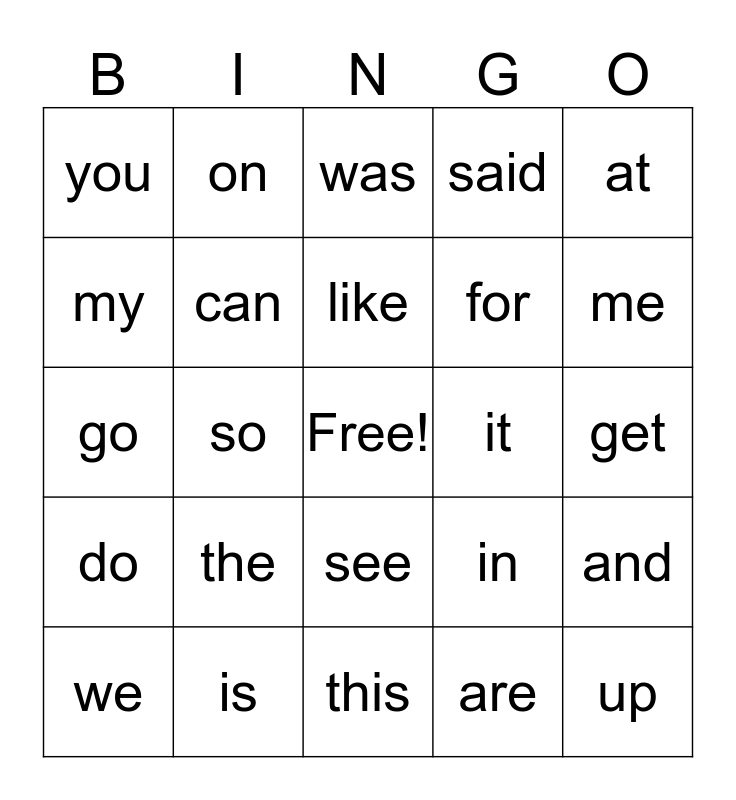 This bingo card has a free space and 24 words: the, is, like, we, at, you, my, on, it, see, for, go, in, and, can, are, get, was, me, so, up, do, said and this.
