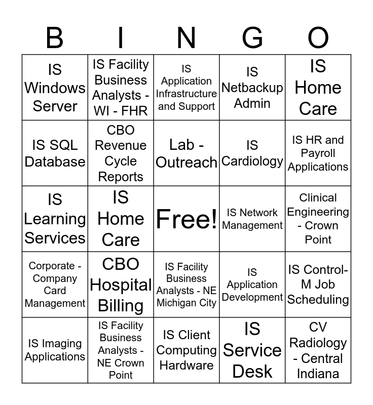 This bingo card has a free space and 94 words: IS Printers - Northwest Indiana, IS Financial Applications, IS Client Computing Hardware, IS Application Integration, IS Business Communication Applications, IS BOE/Cypress Prod Control, IS Client Computing Applications, IS Imaging Applications, IS Cypress Admin, IS Service Desk, Corporate Data Integrity, IS Ambulatory, IS Emergency Department Services, IS Cardiology, IS HIM, IS Home Care, IS Application Infrastructure and Support, IS Revenue Cycle, IS Surgery and Anesthesia, IS Inpatient Orders and Documentation, IS Radiology, IS Epic Security, IS Pharmacy, IS SQL Database, CBO Hospital Billing, CBO Revenue Cycle Reports, CBO/ABO Rev Cycle Website Security, CBO Hospital ADT/Scheduling - CI/WI, CBO Hospital ADT/Scheduling - NI/SSC, IS Facility Business Analysts - Northern West, IS Facility Business Analysts - NE Crown Point, IS Facility Business Analysts - NE Michigan City, IS Facility Business Analysts - South Suburban Chicago, IS Facility Business Analysts - Central, IS Facility Business Analysts - WI - FHR, IS Facility Business Analysts - WI - FHL and FHC, IS Directors, Lab - LIS Admins, Lab - Outreach, IS Application Development, IS Learning Services, Corporate - Company Card Management, Clinical Engineering - Crown Point, Clinical Engineering - Michigan City, CV Radiology - Central Indiana, IS Application Integration, IS Business Communication Applications, IS BOE/Cypress Prod Control, IS Client Computing Applications, IS Imaging Applications, IS Cypress Admin, IS Service Desk, Corporate Data Integrity, IS Ambulatory, IS Emergency Department Services, IS Cardiology, IS HIM, IS Printers - Northwest Indiana, IS Financial Applications, IS Client Computing Hardware, IS Home Care, IS Application Infrastructure and Support, IS Revenue Cycle, IS Surgery and Anesthesia, IS Inpatient Orders and Documentation, IS Radiology, IS Epic Security, IS Pharmacy, IS SQL Database, IS Security Technologists, IS AME - Central Indiana, IS Printers - Central Indiana, IS Site Support - Central Indiana, IS AME - Northwest Indiana, IS Netbackup Admin, IS NOC Operations, IS Document Management, IS HR and Payroll Applications, IS Control-M Job Scheduling, IS Credentialing, IS SAN, IS Security Access, IS Unix/Linux/Oracle Server, IS Network Management, IS Windows Server, IS Application Training - Clinical, IS Application Training - Business, IS Connect Technical Admin, IS Risk and Compliance, IS Vocera, IS Enterprise - AME, Clinical Informatics - Central, Clinical Informatics - Western and IS Theft - All Devices.