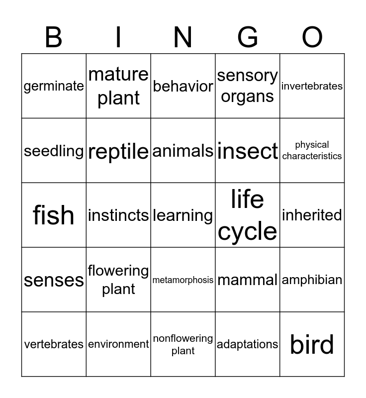 This bingo card has 25 words: flowering plant, nonflowering plant, animals, vertebrates, invertebrates, germinate, seedling, mature plant, life cycle, metamorphosis, insect, fish, mammal, amphibian, reptile, bird, inherited, behavior, physical characteristics, instincts, learning, environment, senses, sensory organs and adaptations.