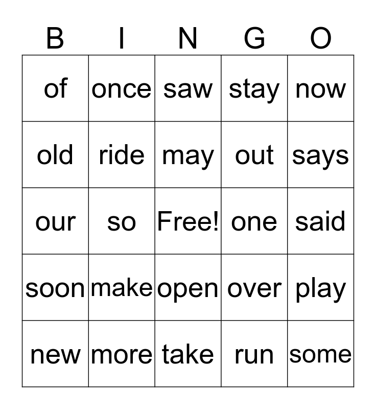This bingo card has a free space and 24 words: make, more, may, new, now, of, old, once, one, open, out, our, over, play, ride, run, said, saw, says, so, some, soon, stay and take.
