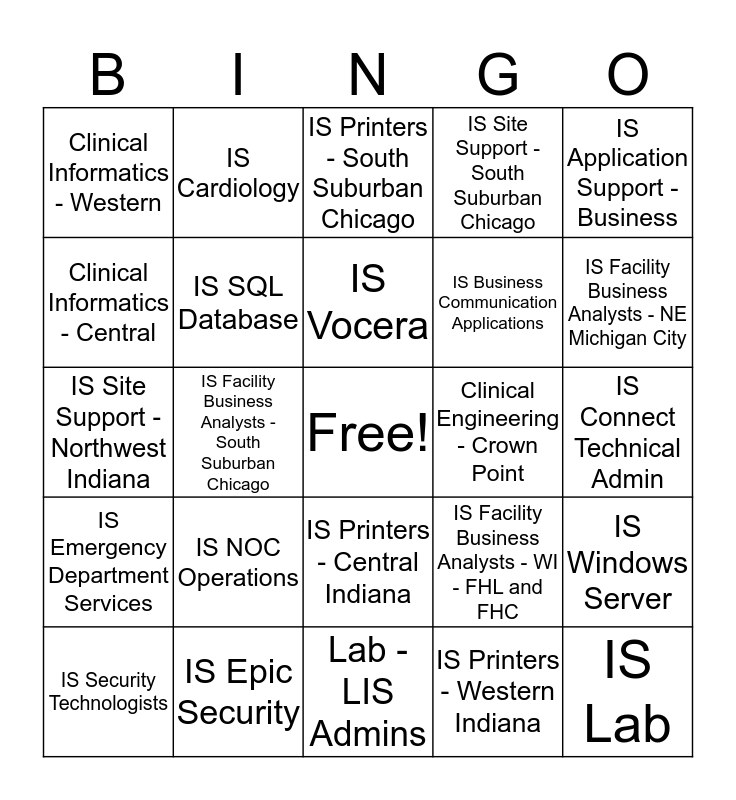 This bingo card has a free space and 88 words: IS Printers - Northwest Indiana, IS AME - Central Indiana, IS Printers - Central Indiana, IS Site Support - Central Indiana, IS AME - Northwest Indiana, IS Document Management, IS HR and Payroll Applications, IS Credentialing, IS SAN, IS Security Access, IS Unix/Linux/Oracle Server, IS Network Management, IS Windows Server, IS Connect Technical Admin, IS Risk and Compliance, IS Vocera, IS Theft - All Devices, IS BI Reporting, IS ETL, ABO Professional Billing, ABO Revenue Cycle Reports, CBO Hospital Billing, IS Site Support - Northwest Indiana, IS AME - Western Indiana, IS Printers - Western Indiana, IS Site Support - Western Indiana, IS AME - Northeast Indiana, IS Michigan City - Printers, IS Michigan City - Site Support, IS AME - South Suburban Chicago, IS Printers - South Suburban Chicago, IS Site Support - South Suburban Chicago, IS Tech Refresh, IS Service Desk, IS NOC Operations, Clinical Informatics - Central, Clinical Informatics - Western, IS Facility Business Analysts - Northern West, IS Facility Business Analysts - NE Crown Point, IS Facility Business Analysts - NE Michigan City, IS Facility Business Analysts - South Suburban Chicago, IS Facility Business Analysts - Central, IS Facility Business Analysts - WI - FHR, IS Facility Business Analysts - WI - FHL and FHC, Clinical Engineering - Crown Point, Clinical Engineering - Michigan City, IS Financial Applications, IS Client Computing Hardware, IS Application Integration, IS Business Communication Applications, IS BOE/Cypress Prod Control, IS Client Computing Applications, IS Imaging Applications, IS Cypress Admin, Corporate Data Integrity, IS Ambulatory, IS Emergency Department Services, IS Cardiology, IS HIM, IS Home Care, IS Application Infrastructure and Support, IS Revenue Cycle, IS Surgery and Anesthesia, IS Inpatient Orders and Documentation, IS Radiology, IS Epic Security, IS Pharmacy, IS SQL Database, IS Security Technologists, IS Lab, IS Netbackup Admin, CV Radiology - Central Indiana, IS Application Support - Clinical and Rev Cycle, IS Application Support - Business, IS Control-M Job Scheduling, IS Application Training - Clinical, IS Application Training - Business, IS Enterprise - AME, Lab - LIS Admins, Lab - Outreach, CBO Revenue Cycle Reports, CBO/ABO Rev Cycle Website Security, CBO Hospital ADT/Scheduling - CI/WI, CBO Hospital ADT/Scheduling - NI/SSC, IS Directors, IS Application Development, IS Learning Services and Corporate - Company Card Management.