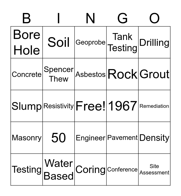 This bingo card has a free space and 26 words: Engineer, Conference, Asbestos, Water Based, Drilling, Bore Hole, Concrete, Soil, Remediation, Pavement, Rock, Slump, Density, Testing, Resistivity, Vibracore, Tank Testing, Masonry, Geoprobe, Site Assessment, Grout, Coring, 1967, 50, Spencer Thew and Marijean.