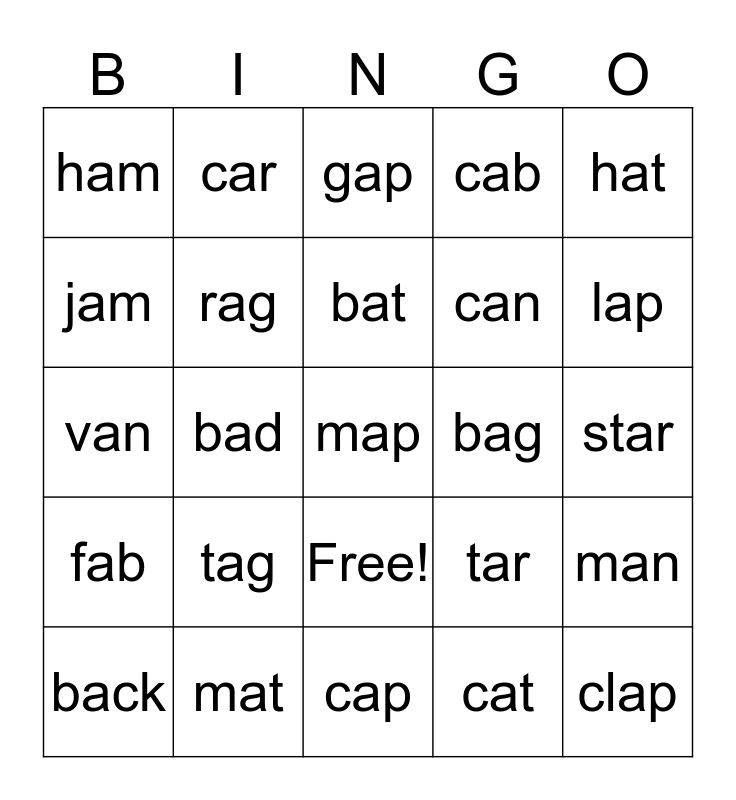 This bingo card has 26 words: Free!, cat, bat, mat, hat, ham, jam, car, star, tar, can, van, man, back, bad, dad, cab, fab, gap, map, lap, cap, bag, tag, rag and clap.