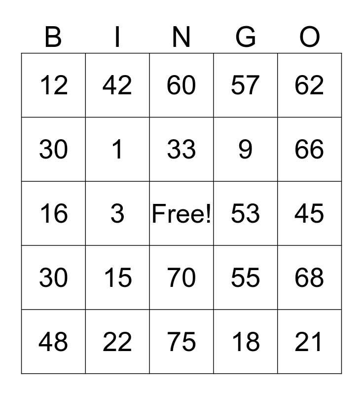 This bingo card has a free space and 24 words: 15, 22, 33, 48, 62, 12, 30, 42, 53, 70, 9, 16, 55, 68, 1, 18, 45, 60, 66, 3, 21, 30, 57 and 75.