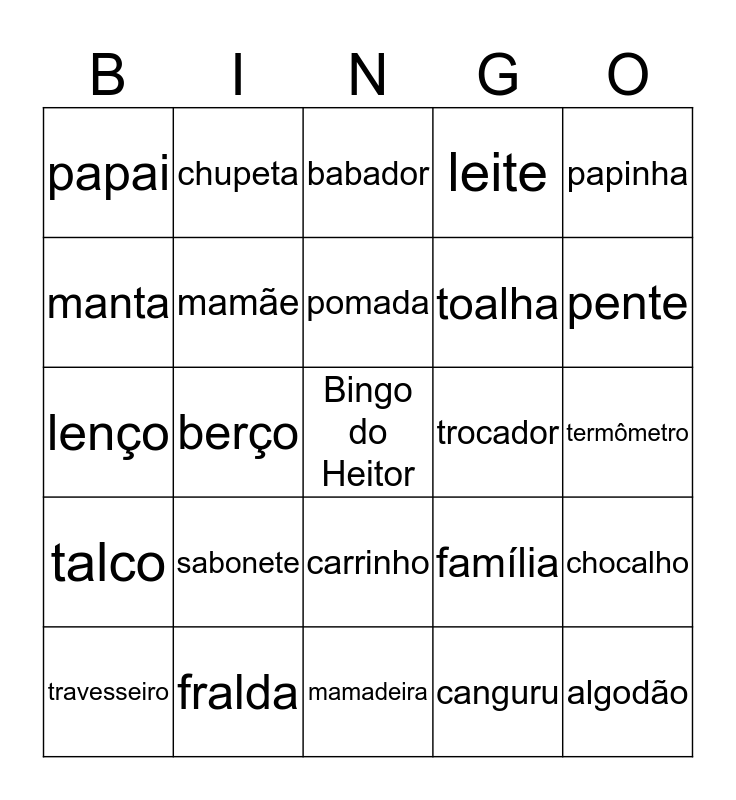 This bingo card has a free space and 24 words: sabonete, fralda, pomada, travesseiro, papinha, papai, manta, chupeta, trocador, carrinho, toalha, lenço, família, chocalho, mamãe, canguru, termômetro, babador, pente, berço, algodão, talco, leite and mamadeira.