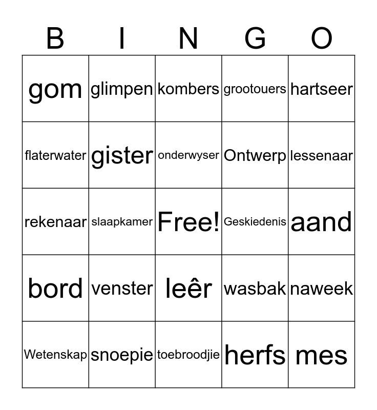 This bingo card has a free space and 24 words: venster, snoepie, onderwyser, Wetenskap, hartseer, gom, flaterwater, glimpen, Geskiedenis, leêr, Ontwerp, rekenaar, wasbak, naweek, gister, herfs, aand, kombers, lessenaar, slaapkamer, mes, bord, grootouers and toebroodjie.
