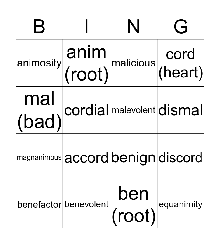 This bingo card has 16 words: benevolent, discord, malicious, animosity, magnanimous, anim (root), benign, ben (root), mal (bad), cordial, benefactor, cord (heart), accord, dismal, malevolent and equanimity.