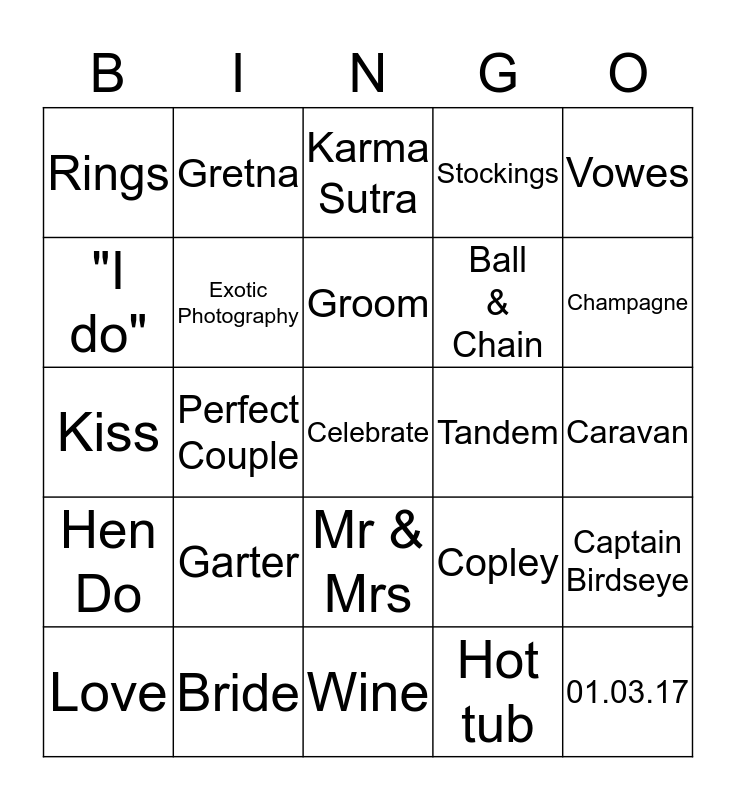 This bingo card has a free space and 24 words: Garter, Bride, Groom, Love, Vowes, Rings, "I do", Gretna, Tandem, Mr & Mrs, Ball & Chain, Kiss, Copley, Captain Birdseye, Exotic Photography, Hot tub, Caravan, Karma Sutra, Champagne, Perfect Couple, 01.03.17, Hen Do, Stockings and Wine.