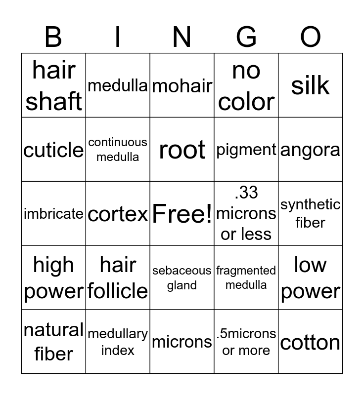 This bingo card has a free space and 24 words: hair follicle, medullary index, root, natural fiber, silk, hair shaft, cuticle, medulla, .33 microns or less, sebaceous gland, pigment, imbricate, fragmented medulla, low power, continuous medulla, .5microns or more, synthetic fiber, mohair, angora, cortex, cotton, high power, no color and microns.