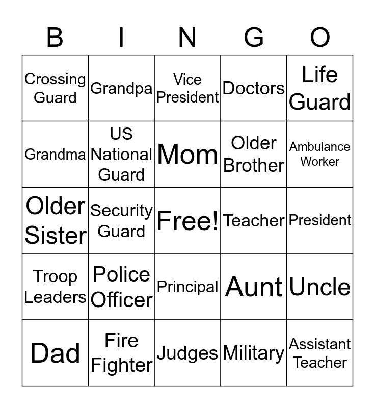 This bingo card has a free space and 24 words: Police Officer, Fire Fighter, Mom, Dad, Life Guard, Crossing Guard, Grandma, Grandpa, Teacher, Principal, Older Brother, Older Sister, Aunt, Uncle, US National Guard, Military, President, Vice President, Ambulance Worker, Security Guard, Assistant Teacher, Troop Leaders, Doctors and Judges.