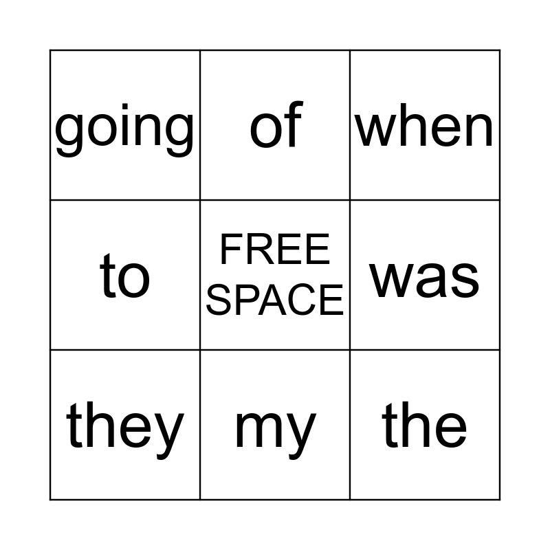 This bingo card has a free space and 8 words: was, when, of, they, going, the, to and my.