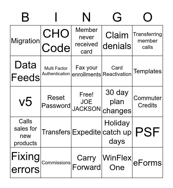 This bingo card has a free space and 24 words: Transfers, Commissions, Fax your enrollments, Fixing errors, Transferring member calls, Migration, Data Feeds, CHO Code, 30 day plan changes, Expedite, Card Reactivation, v5, Holiday catch up days, PSF, Multi Factor Authentication, WinFlex One, Commuter Credits, Member never received card, Templates, Reset Password, eForms, Calls sales for new products, Claim denials and Carry Forward.