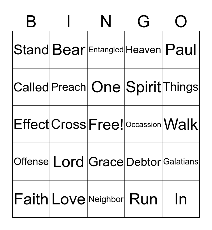 This bingo card has a free space and 24 words: Lord, Love, One, Faith, Paul, Stand, Called, Bear, Occassion, Grace, Spirit, Effect, Debtor, Galatians, Preach, Run, Walk, Entangled, Things, Cross, In, Offense, Heaven and Neighbor.
