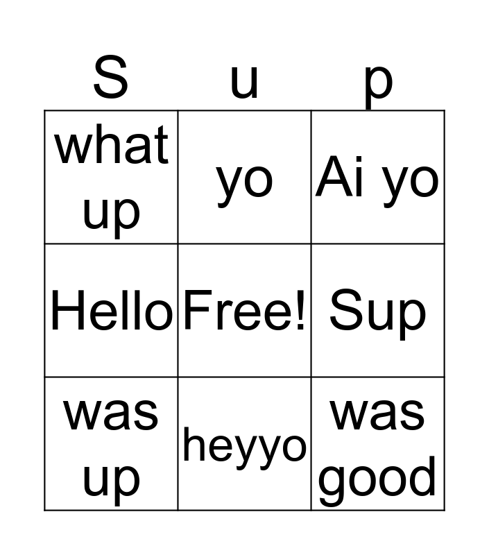 This bingo card has a free space and 8 words: Sup, Ai yo, yo, was up, what up, was good, Hello and heyyo.
