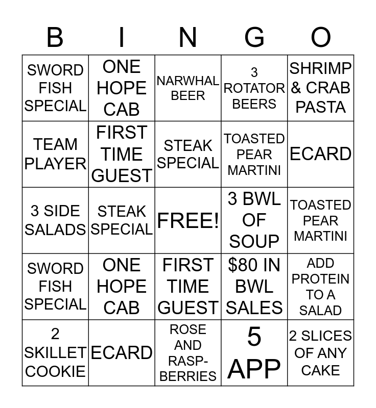 This bingo card has a free space and 24 words: ONE HOPE CAB, ECARD, STEAK SPECIAL, 2 SKILLET COOKIE, SHRIMP & CRAB PASTA, SWORD FISH SPECIAL, TEAM PLAYER, ONE HOPE CAB, 3 BWL OF SOUP, FIRST TIME GUEST, TOASTED PEAR MARTINI, 3 SIDE SALADS, $80 IN BWL SALES, ADD PROTEIN TO A SALAD, FIRST TIME GUEST, 5 APP, TOASTED PEAR MARTINI, NARWHAL BEER, ECARD, STEAK SPECIAL, 2 SLICES OF ANY CAKE, SWORD FISH SPECIAL, 3 ROTATOR BEERS and ROSE AND RASP-BERRIES.
